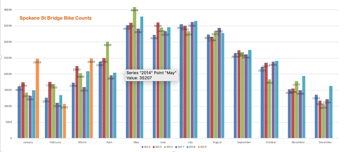 The Spokane Street Bridge 24/7/365 bike counter doesn’t count all bike rides in our area, but it shows the trends for people using bikes. It usually tracks closely with the Fremont Bridge trends. Looking at the bridge counts provides solid data vs. just surveys or one-day counts.