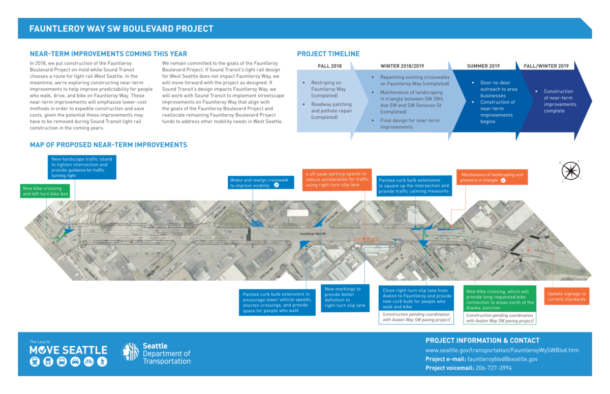Short-term improvements on the long-delayed Fauntleroy Boulevard Project are starting soon. Work includes good intersection safety improvements for people on bikes and on foot, especially at SW Alaska/Fauntleroy and at 36th/Avalon/Fauntleroy.