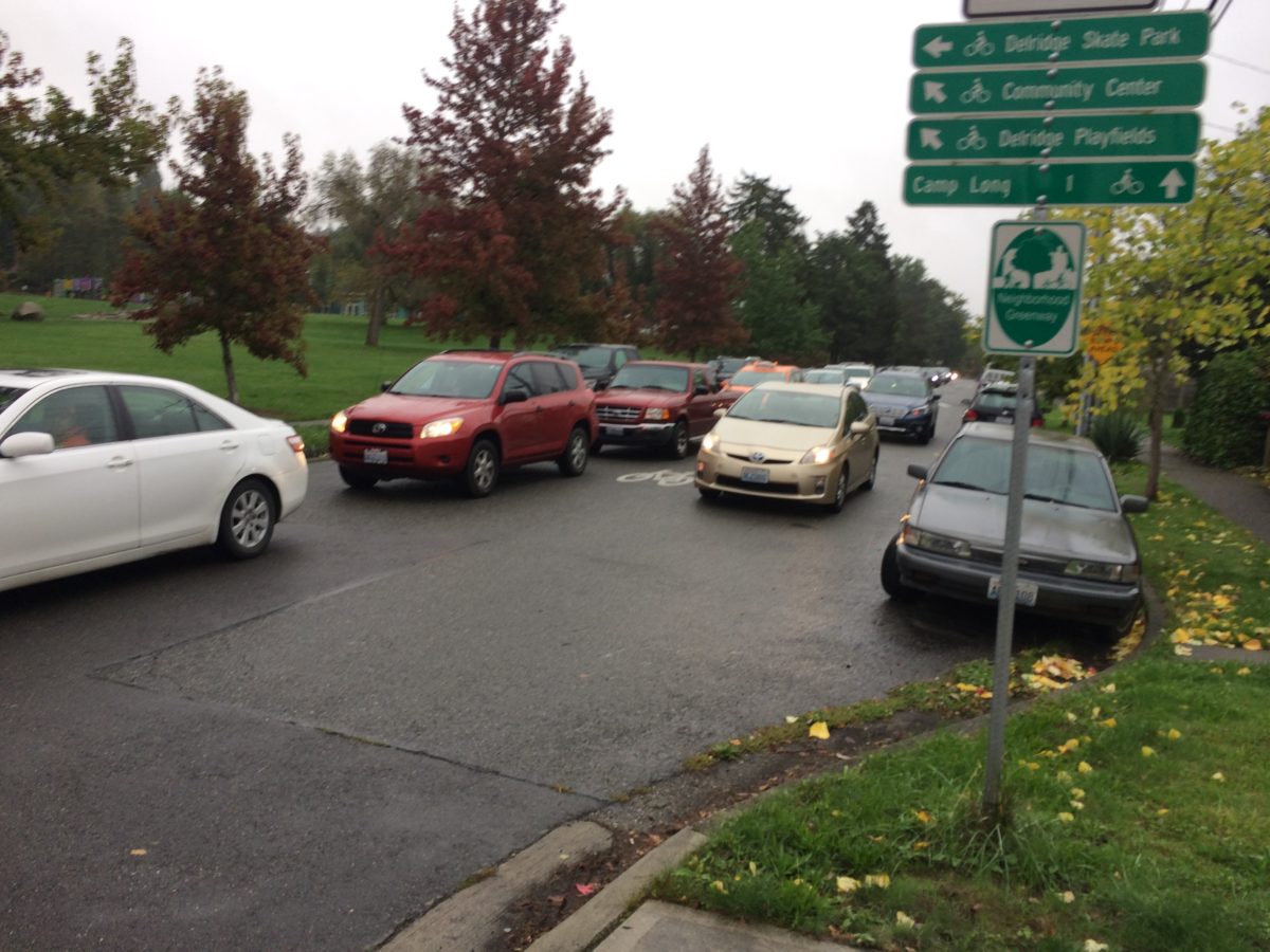 This is a two-way residential street. It was West Seattle’s first neighborhood greenway, intended to be low speed with low volumes, safe for walking and biking, with features to discourage cars from using it instead of the parallel arterial. Not working!