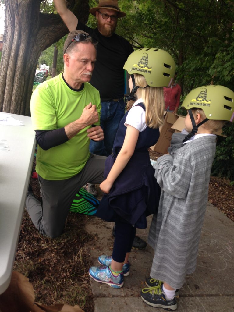 Bob Winship fitting new helmets for two young bike riders.